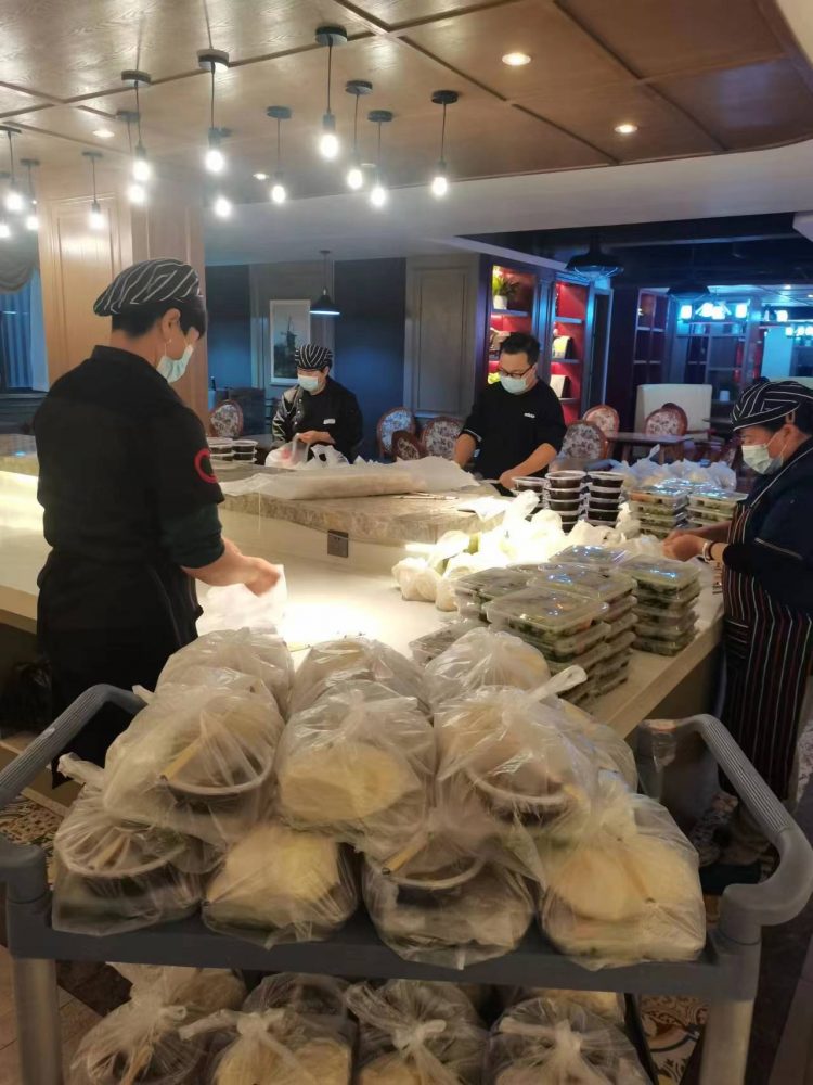 隔離點防疫工作者夜以繼日,“黨員先鋒隊”帶領(lǐng)酒店工作人員同隔離人員一樣閉環(huán)管理,24小時堅守在酒店,保障所有被隔離人員和醫(yī)護人員每日三餐,每餐約150人,每日用餐約450人次。